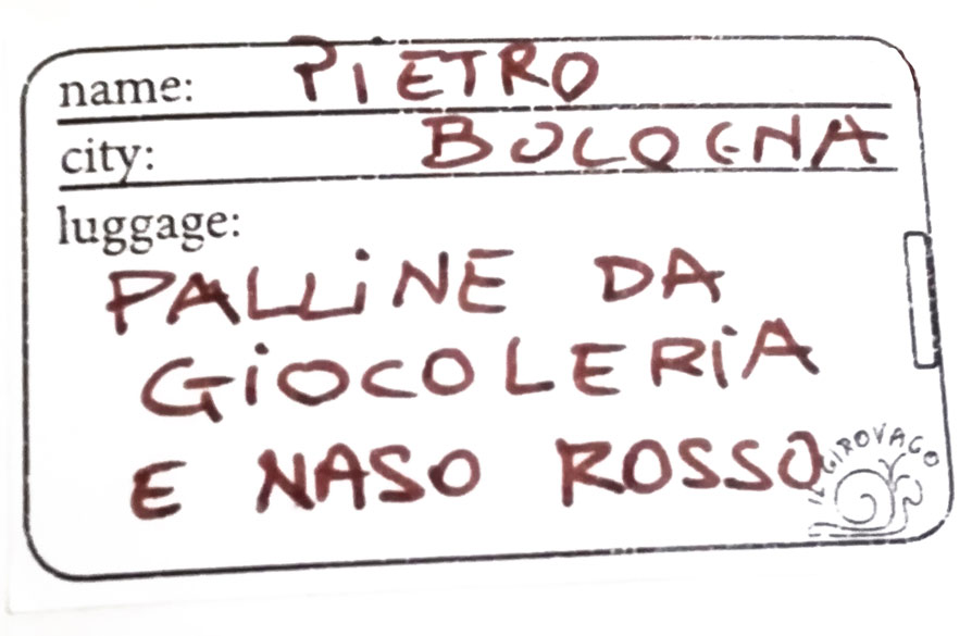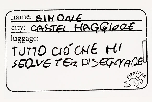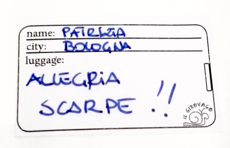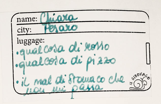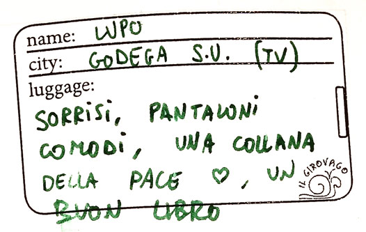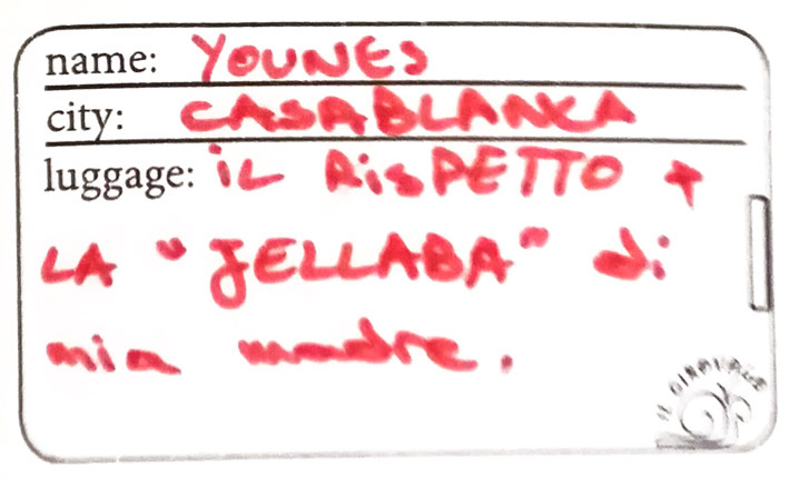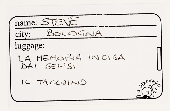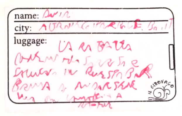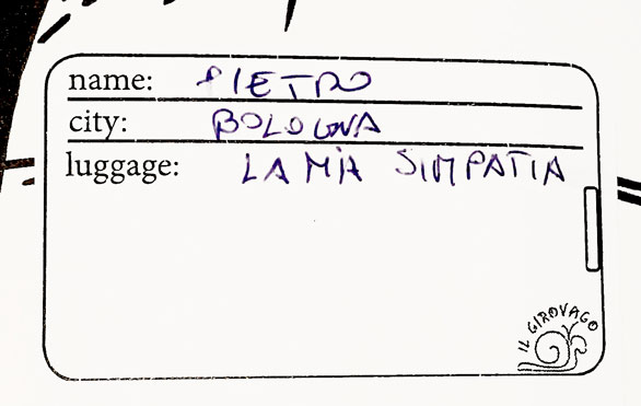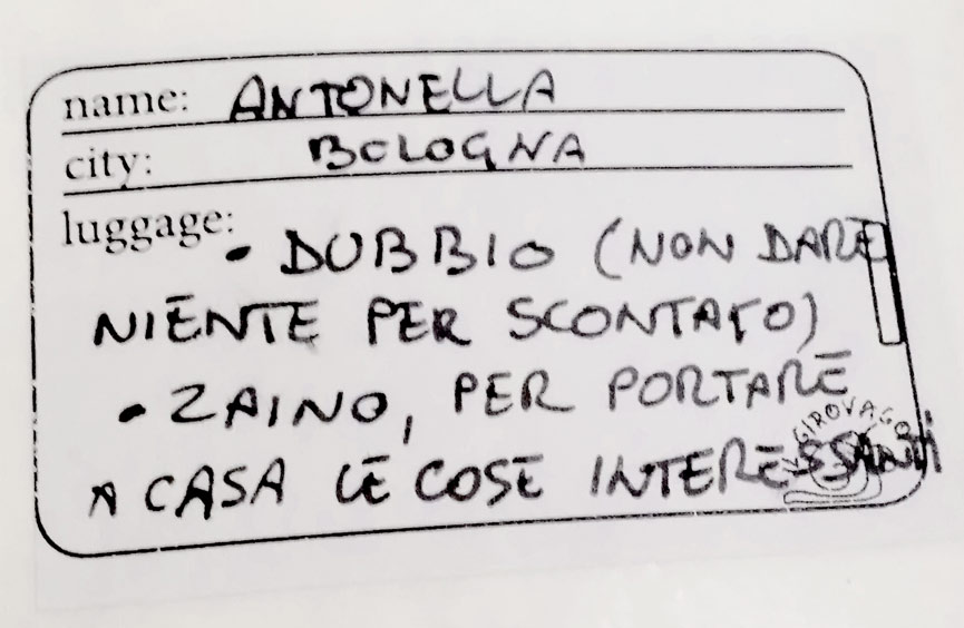 Il disegno è rimasto in esposizione sulle pareti del Caffè Belmeloro per qualche giorno, ma il Girovago, stuzzicato dalle risposte ricevute, vuole riproporre anche qui le etichette compilate durante la serata. Si tratta, in fondo, di tante storie in miniatura, che raccontano dell’estrema diversità e imprevedibilità dei viaggiatori. Per fare qualche esempio, c’è chi non può rinunciare alla propria macchina fotografica, chi al materiale per scrivere o per disegnare, ma c’è anche chi ha pensato bene di non dimenticare il cuscino, le proprie scarpe, o le proprie pentole… Ripensandoci, forse è meglio prendere anche Ipod e gel per i capelli… Per i golosi non possono mancare caffè, tè, biscotti, pane, salsicce, o una buona dose di peperoncino, ma c’è chi si ricorda soltanto di portare con sé soltanto “molta fame”. Che è anche fame di scoperte, di conoscenza e di storia, senza dimenticare, come ricorre più volte, “il beneficio del dubbio”. C’è chi si porta entusiasmo e sorrisi e chi si ricorda di poterli regalare, con le palline da giocoleria e un naso rosso. C’è chi non dimentica le persone che gli stanno accanto, oppure il ricordo delle persone care: c’è chi si porta la djellaba della madre, ad esempio, anche perché molte etichette parlano di viaggi già fatti, e in altre si ipotizzano viaggi che ancora si devono fare. C’è chi sa di doversi portare anche il “mal di stomaco che non passa”, ma porta con sé anche “qualcosa di rosso” e “qualcosa di pizzo”, perché viaggiare è anche affrontare nuovi capodanni, nuovi inizi.
