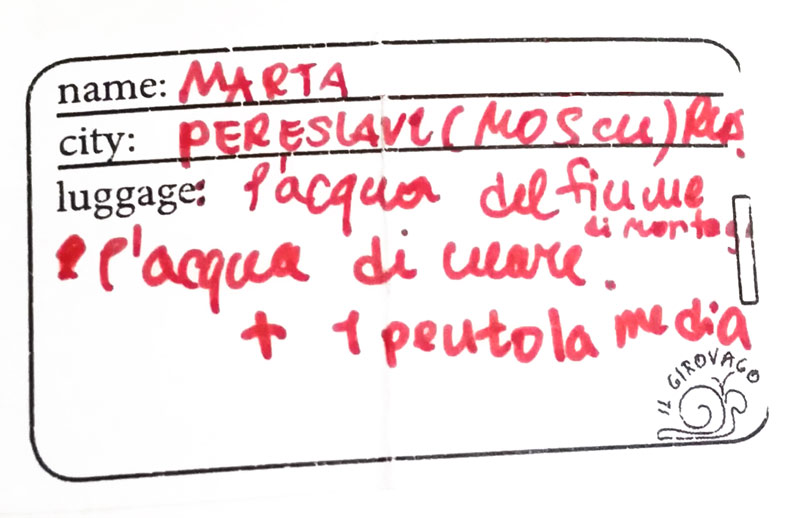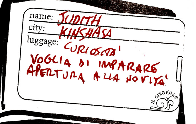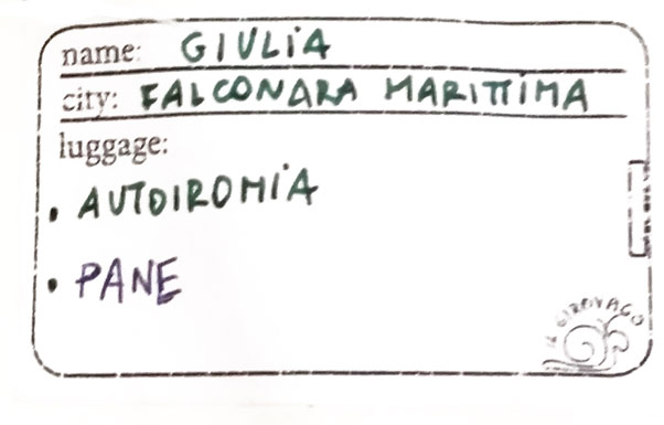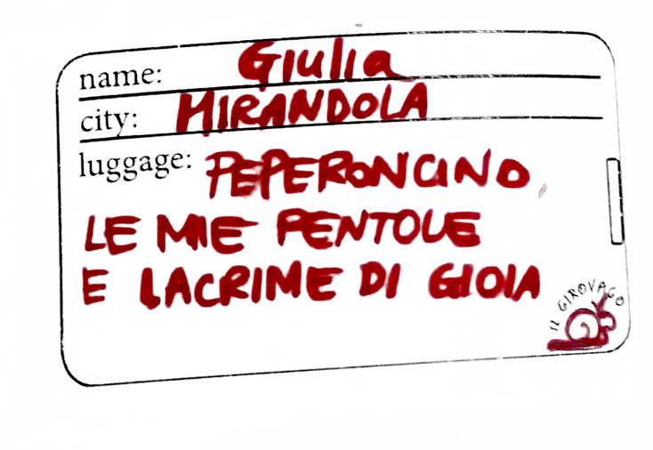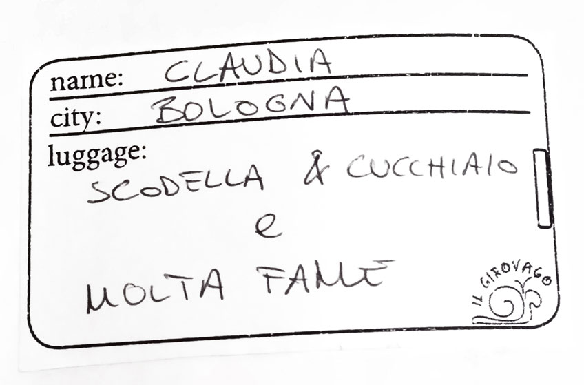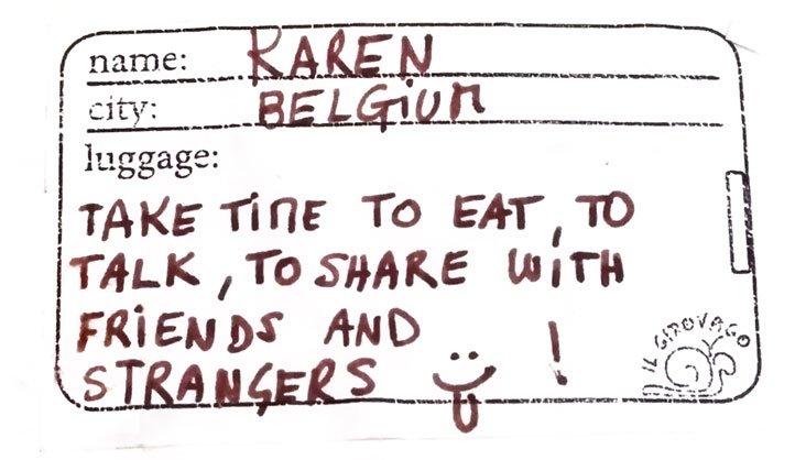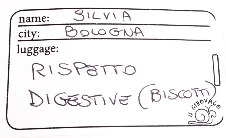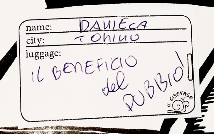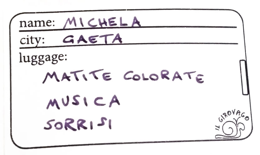 Il disegno è rimasto in esposizione sulle pareti del Caffè Belmeloro per qualche giorno, ma il Girovago, stuzzicato dalle risposte ricevute, vuole riproporre anche qui le etichette compilate durante la serata. Si tratta, in fondo, di tante storie in miniatura, che raccontano dell’estrema diversità e imprevedibilità dei viaggiatori. Per fare qualche esempio, c’è chi non può rinunciare alla propria macchina fotografica, chi al materiale per scrivere o per disegnare, ma c’è anche chi ha pensato bene di non dimenticare il cuscino, le proprie scarpe, o le proprie pentole… Ripensandoci, forse è meglio prendere anche Ipod e gel per i capelli… Per i golosi non possono mancare caffè, tè, biscotti, pane, salsicce, o una buona dose di peperoncino, ma c’è chi si ricorda soltanto di portare con sé soltanto “molta fame”. Che è anche fame di scoperte, di conoscenza e di storia, senza dimenticare, come ricorre più volte, “il beneficio del dubbio”. C’è chi si porta entusiasmo e sorrisi e chi si ricorda di poterli regalare, con le palline da giocoleria e un naso rosso. C’è chi non dimentica le persone che gli stanno accanto, oppure il ricordo delle persone care: c’è chi si porta la djellaba della madre, ad esempio, anche perché molte etichette parlano di viaggi già fatti, e in altre si ipotizzano viaggi che ancora si devono fare. C’è chi sa di doversi portare anche il “mal di stomaco che non passa”, ma porta con sé anche “qualcosa di rosso” e “qualcosa di pizzo”, perché viaggiare è anche affrontare nuovi capodanni, nuovi inizi.