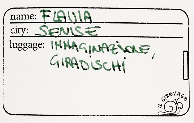 Nel disegno, la cui realizzazione si può vedere in questo breve e coinvolgente time lapse, campeggia la chiocciola del Girovago. Porta con sé un carico di valigie che sono unite tra loro da un rocchetto di filo che a sua volta è impugnato da un viaggiatore in erba, in calzoncini corti. La chiocciola trascina a sé il viaggiatore, nel paradosso di quel viaggio lento, senza frenesie turistiche, che affascina il Girovago e, un po’ a sorpresa, lo travolge.