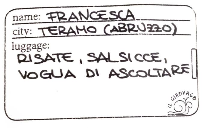 Nel corso della presentazione della collana di libri Il Girovago, di questo blog e del progetto Diari da uno spettacolo 2014, le domande sono state girate a tutti i presenti. A ognuno dei partecipanti è stata consegnata un’etichetta da valigia sulla quale scrivere il nome, la città di provenienza e il tipo di bagaglio strettamente necessario per il viaggio. In seguito le etichette sono state incollate sul grande disegno che Vingenzo Beccia – co-autore, insieme alla drammaturga Viviana Salvati, dei “Diari da uno spettacolo 2014” – ha eseguito live durante la presentazione.